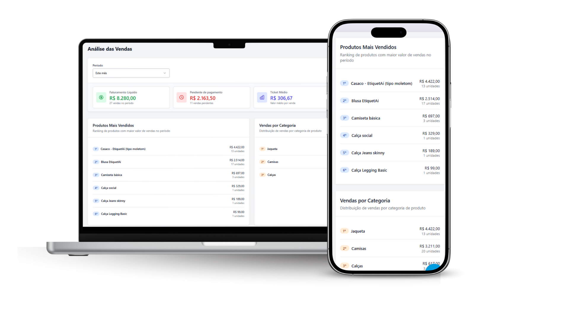 Neste cenário, plataformas como o EtiquetAi permitem o acompanhamento das vendas tempo real, automatizando relatórios e enviando resumos semanais para o celular do dono (a) da loja. Isso simplifica o processo, pois você não depende de controles manuais ou de revisar planilhas demoradas sempre que precisar de uma informação rápida.
